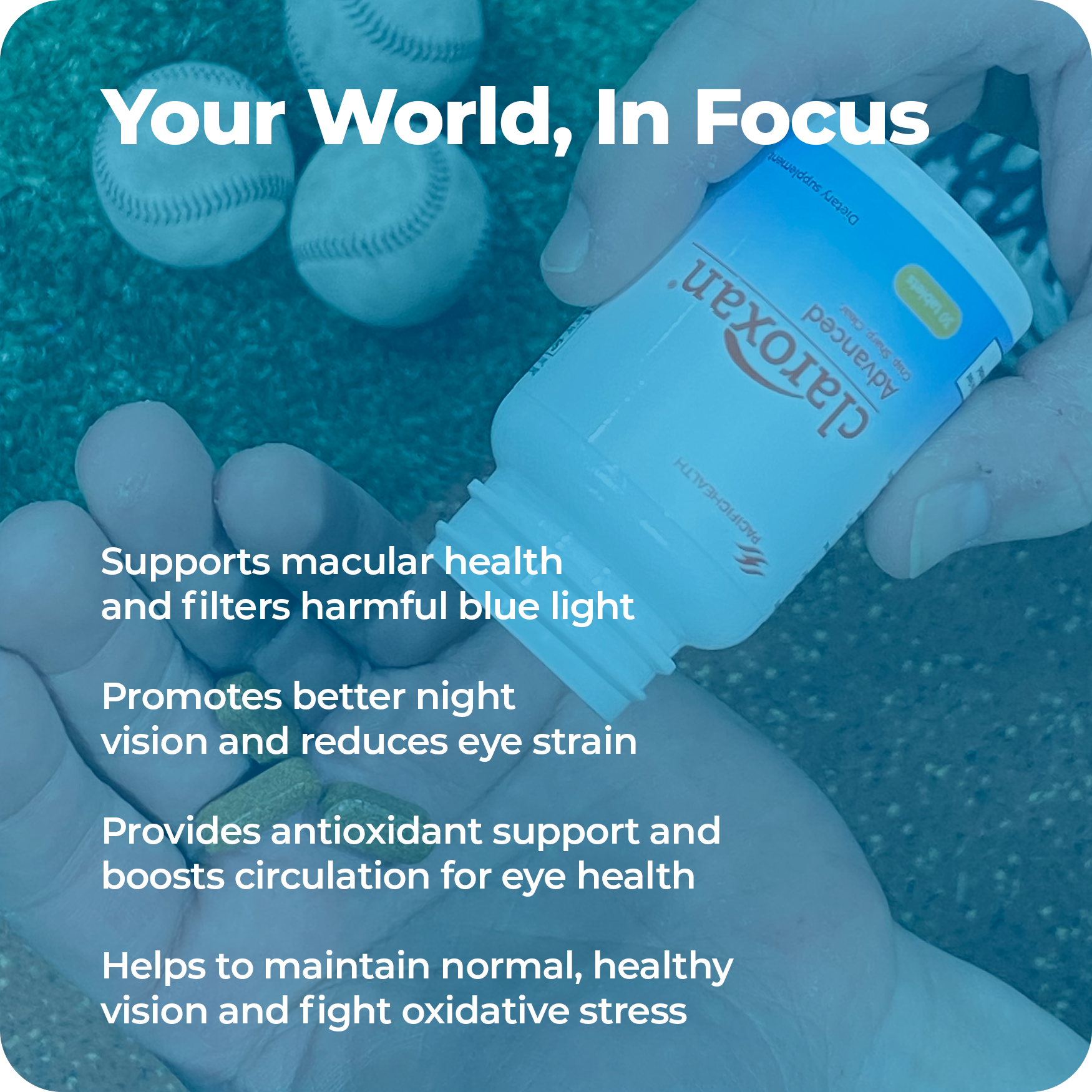 Claroxan Advanced is a vision support supplement designed to promote long-term eye health, enhance visual clarity, and support night vision.* Formulated with scientifically researched ingredients, Claroxan Advanced helps protect against oxidative stress while nourishing the eyes with essential nutrients.*