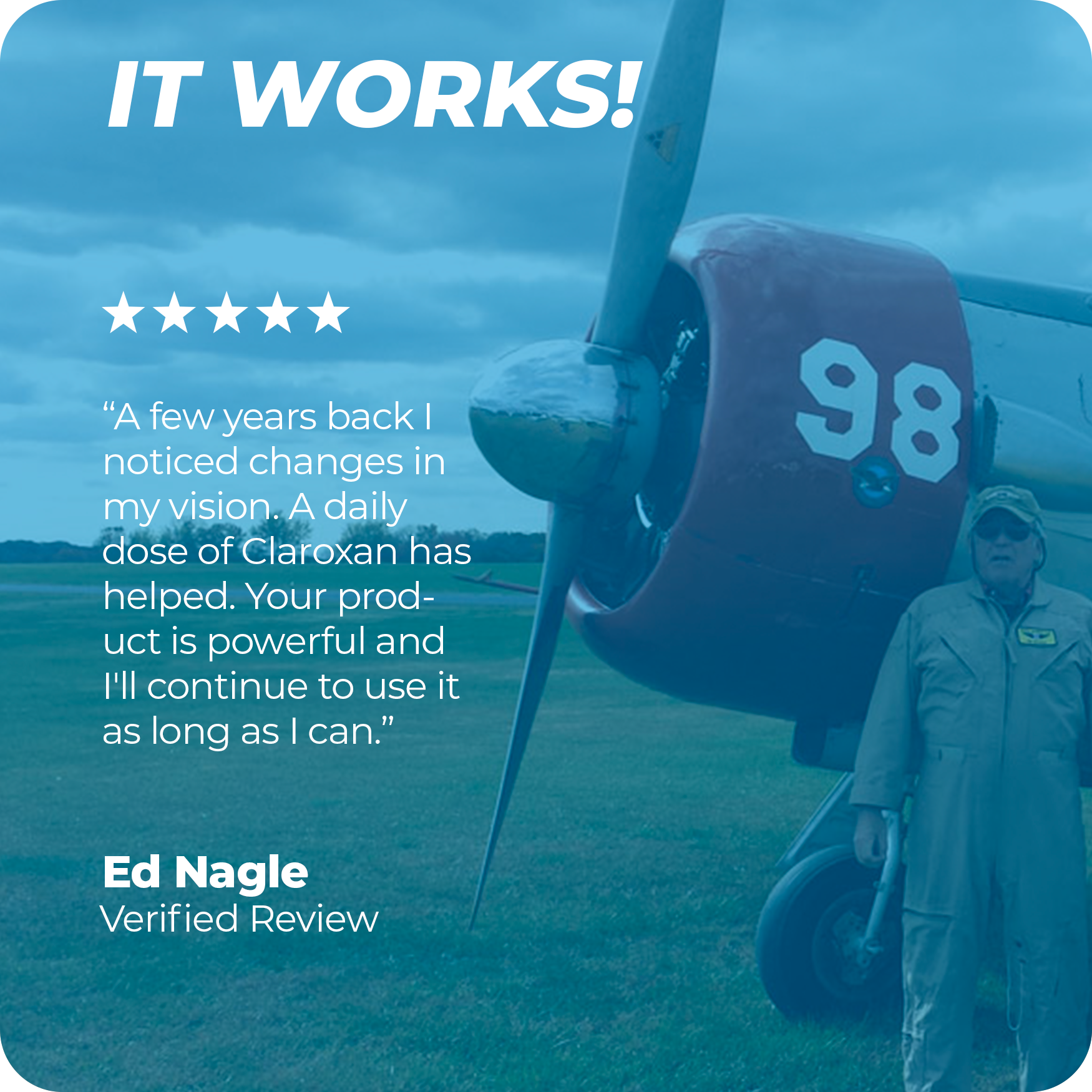“My eyesight was deteriorating, and I was worried that it would affect my flying ability. For the past three eye exams my vision has improved every year!* My eye doctor is amazed at the improvement happening given my age. In March, I went for my flight physical and came very close to not having to wear corrective lenses at all. If my eyesight continues to improve at this rate, I could be glasses free.* My wife, also a glasses wearing pilot, is now taking Claroxan® because she has seen the improvement in my sight.*”